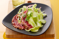 Goveji trakovi na žaru s hrustljavimi listki brokolija in solato iz koriandra ter kumar