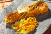 Paniran brancin na pomarančni in čebulni marmeladi